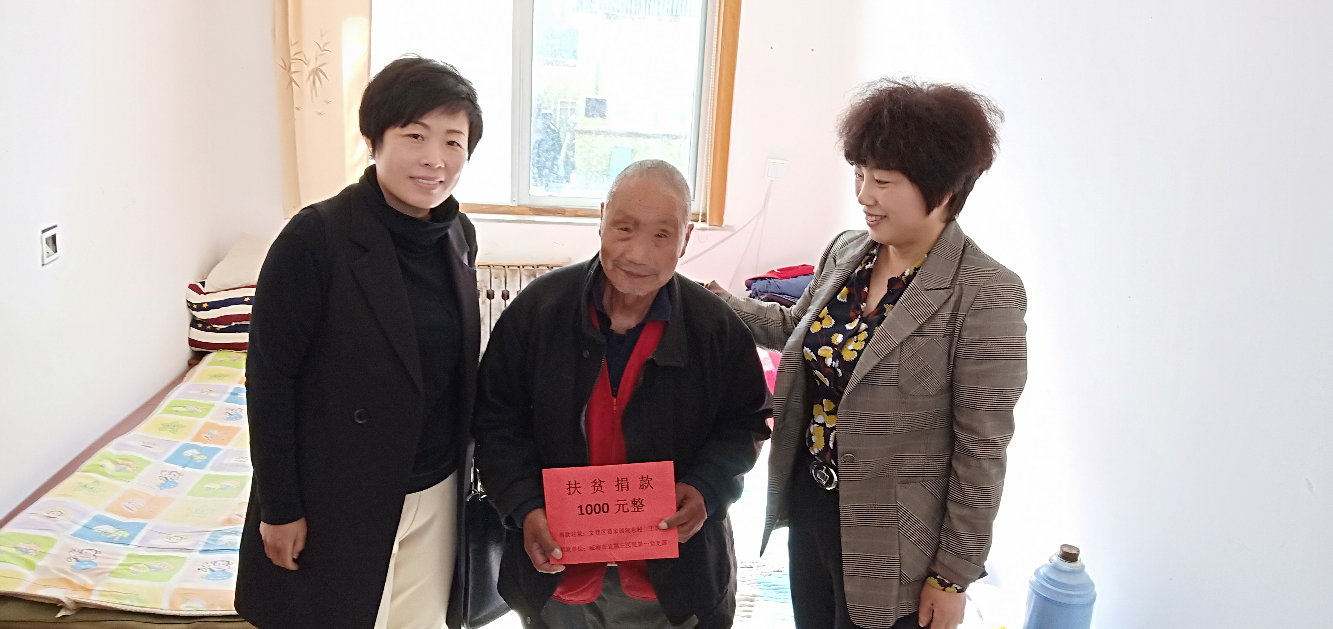 为大力弘扬扶贫济困、乐善好施的传统美德,有效帮助贫困人口实现心愿,进一步提升贫困群众获得感和满意度,10月26日上午,威海市立第三医院由党委牵头,工会、团委配合,联合文登区农业局等部门帮扶责任人分别走进文登区葛家镇、界石镇7名贫困户家中,开展“结对送温暖 共圆微心愿”活动,为贫困户送去了共计6045元扶贫款及过冬用被褥,帮助贫困户解决困难、实现“微心愿”。